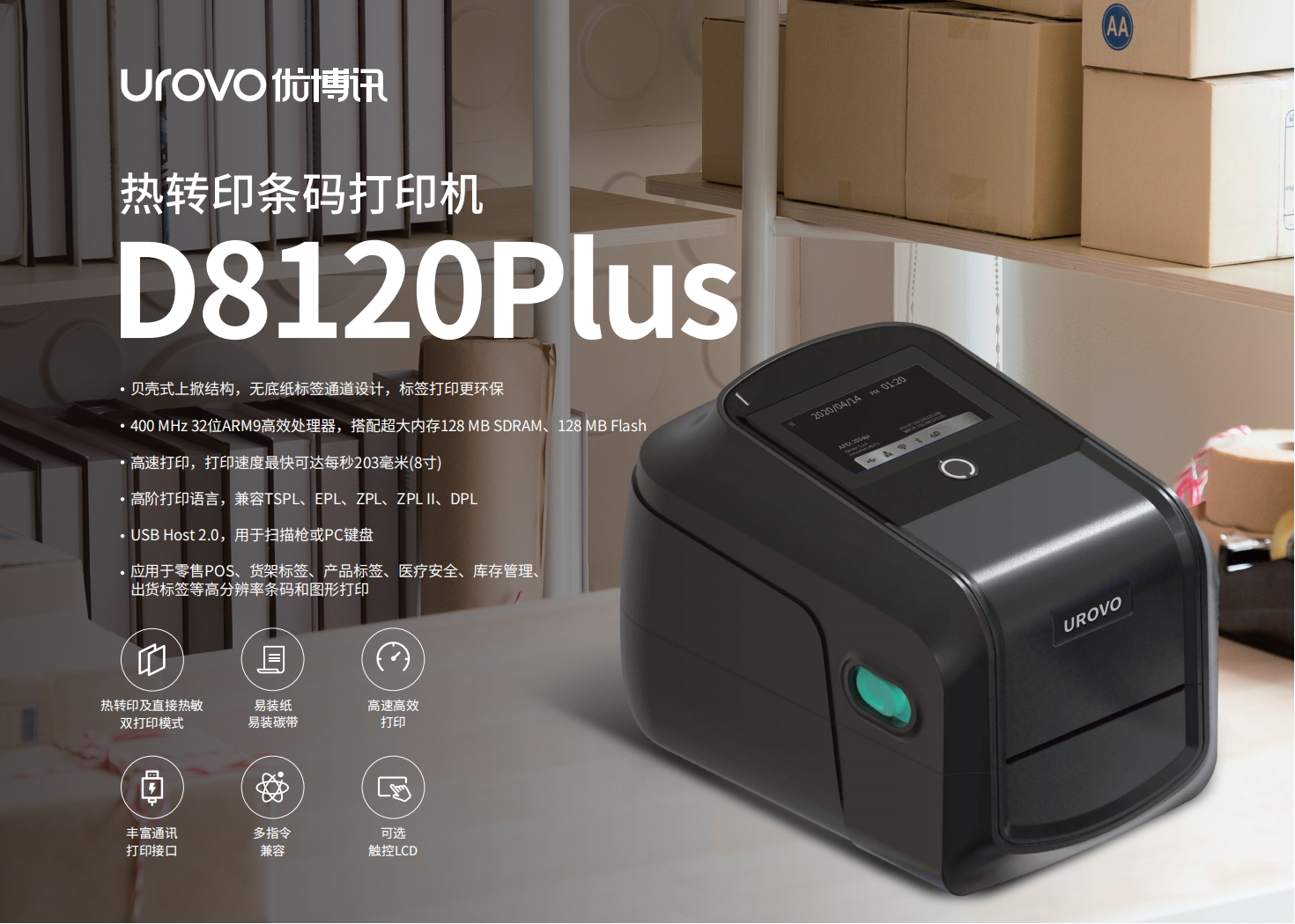 優博訊訊桌面式打印機貝殼式上掀結構,無底紙標簽通道設計,標簽打印更環保。用于掃描槍或PC鍵盤,應用于零售POS、貨架標簽、產品標簽、醫療安全、庫存管理出貨標簽等高分辨率條碼和圖形打印。