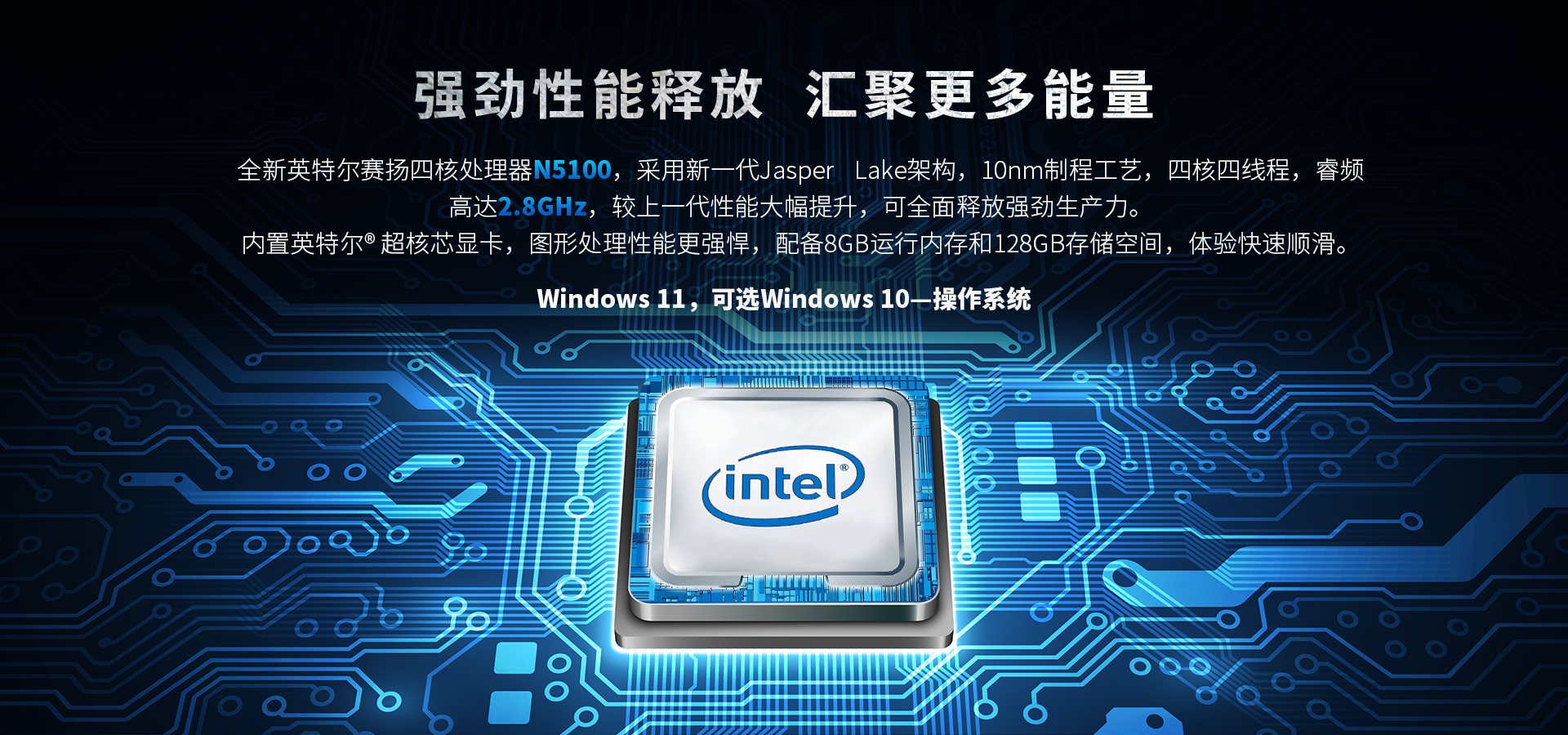 全新英特爾賽揚四核處理器N5100,采用新一代Jasper Lake架構,10nm制程工藝,四核四線程,睿頻高達2.8GHz,較上一代性能大幅提升,可全面釋放強勁生產力。內置英特爾@超核芯顯卡,圖形處理性能更強悍,配備8GB運行內存和128GB存儲空間,體驗快速順滑。