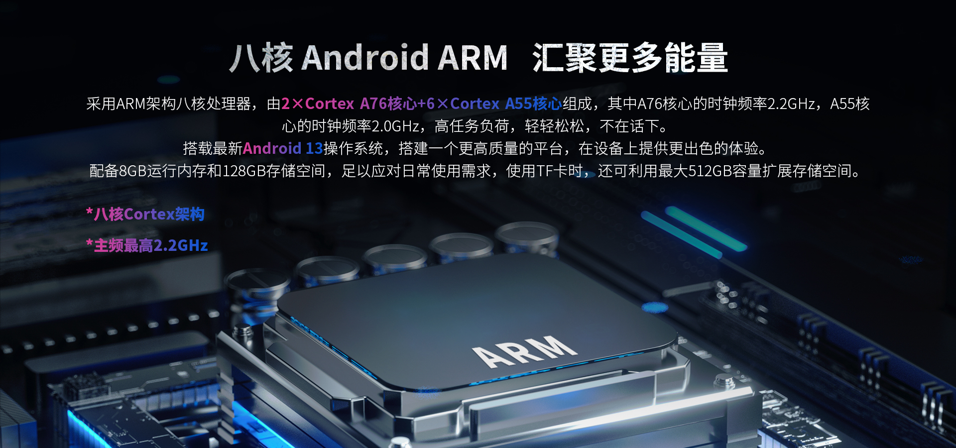 搭載最新Android 13操作系統,搭建一個更高質量的平臺,在設備上提供更出色的體驗。配備8GB運行內存和128GB存儲空間,足以應對日常使用需求,使用TF卡時,還可利用最大512GB容量擴展存儲空間。